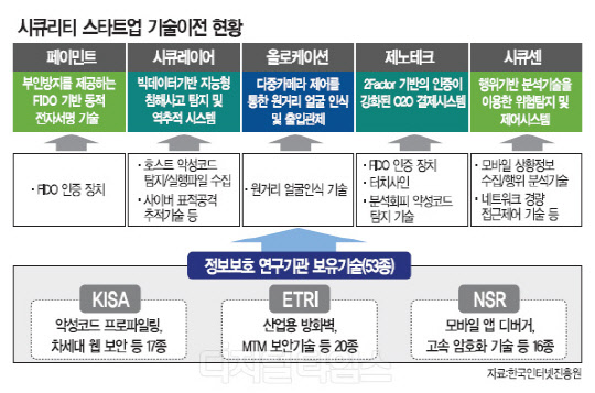 26일 한국인터넷진흥원(KISA, 원장 백기승)은 다양한 R&D와 민·관협력을 통해 정보보호 산업 발전을 꾀하고 있다고 밝혔다. 가장 눈에 띄는 성과는 '시큐리티 스타트업 기술이전 지원' 사업이다. 인터넷진흥원이나 한국전자통신연구원(ETRI), 국가보안기술연구소(NSR) 등 정보보호 연구기관이 개발한 우수기술과 스타트업의 독창적 아이디어를 결합해 신제품을 개발하는데 초점을 맞춘 이 사업은 스타트업에 R&D 지원을 통해 정보보호 산업의 저변을 넓히는 동시에 혁신적인 제품을 탄생시키는데 주력하고 있다. 올해 처음 시작한 이 사업은 현재 페이민트, 시큐레이어, 올로케이션, 제노테크, 시큐센 등 5개 스타트업에 총 11건의 기술을 기술료 50% 감면 조건으로 제공해 제품 개발을 진행 중에 있다.