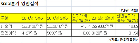 한편 주력 계열사인 GS칼텍스는 3분기 연결 기준으로 매출 6조6060억원, 영업이익 3272억원을 기록했다. 매출액은 전년 동기보다 10.6% 줄었지만, 영업이익은 같은 기간 177.3%나 늘었다. 전 분기와 비교하면 매출은 7% 늘었고 영업이익은 573% 감소했다.