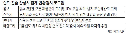 인도에 진출한 자동차 업체들이 친환경차 생산에 적극적으로 나서는 배경에는 인도 정부의 대기오염 대응 정책과 깊은 관련이 있다. 최근 수도 뉴델리는 제조 10년 이상 디젤차의 주행을 금지하는 명령을 내놓고, 내년 4월부터 인도의 유로6에 해당하는 배출가스 기준 BS6를 발동할 계획이다. 아울러 인도 정부는 오는 2020년까지 700만대의 전기차 보급을 목표로 1억6000만달러의 예산도 배정했다. 전기차 충전 인프라 확충 프로젝트도 가동할 전망이다. 이 같은 목표는 중국의 '2020년 500만대'보다도 큰 규모로, 인도 정부의 의지를 엿볼 수 있는 대목이다. 업계 한 관계자는 "인도는 신흥국 시장임에도 불구하고 대기오염 문제에 민감한 국가이기 때문에 단순한 신차 판매 장려 정책보다는 2000㏄ 미만 소형차와 하이브리드 등 친환경차에 대한 혜택과 수요가 갈수록 늘어날 것"이라며 "한국 기업들은 전기차 인프라 확충을 위한 프로젝트 수주에 적극적으로 임해야 할 필요가 있다"고 말했다.