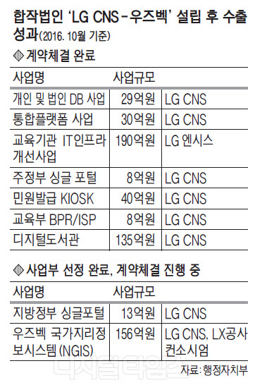 LG CNS가 합작법인 설립 이후 계약을 체결한 우즈벡 현지사업은 개인 및 법인 데이터베이스(DB) 사업(29억원), 통합플랫폼 사업(30억원), 주 정부 싱글 포털(8억원), 민원발급 키오스크(40억원), 교육부 BPR(비즈니스프로세스재설계)·ISP(정보화전략계획)(8억원), 디지털도서관(135억원), 교육기관 IT인프라 개선사업(190억원, LG 엔시스) 등이다. 현재 계약체결이 진행 중인 사업은 지방정부 싱글 포털(13억원), 국가지리정보시스템(156억원) 등으로 169억원 규모다. 회사는 우즈벡 합작법인 운영 성과를 바탕으로 중앙아시아의 다른 국가로 진출을 확대할 계획이다.