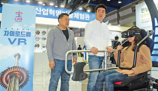17일 서울 삼성동 코엑스에서 열린 '2016대한민국 산업기술 R&D대전'에서 한 참석자가 자이로드롭 VR을 체험하고 있다.