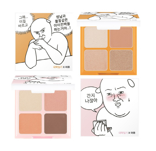 에이블씨엔씨의 어퓨가 인기 웹툰 '대학일기'와 손잡고 '어퓨 포 유어 섀도우 대학일기 에디션' 4품목(사진)을 한정판으로 25일 출시했다.