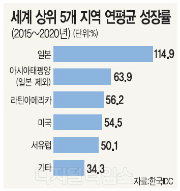 지역적으로 보면 북미지역이 현재까지 AI 관련 지출이 가장 큰 지역으로 올해 관련 매출이 62억달러(7조원)에 이르고 있다. 유럽, 중동 및 아프리카 지역(EMEA)은 북미지역 다음으로 큰 지역이지만, 일본을 포함한 아태 지역의 시장 규모가 2020년까지 EMEA와의 격차를 상당히 줄일 것으로 예상된다.