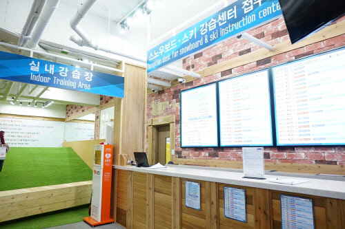 실내강습장에는 중급자 슬로프인 째즈의 경사도 이상인 17도의 슬로프를 재현해 두었다. 실내에서 미리 경사감에 적응해 실제 슬로프에서 훨씬 빠른 실력 향상을 선보일 수 있는 점이 특징이다. 그리고 측면에는 전신거울이 있어 직접 자세를 교정하며 연습할 수 있다.