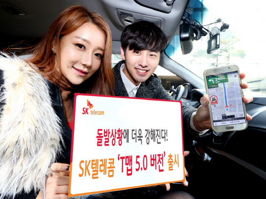 SK텔레콤은 모바일 내비게이션 'T맵'에서 돌발 상황 정보의 정확도를 대폭 개선하고 사용자 환경(UI) 개편한 'T맵 5.0' 버전을 출시한다고 8일 밝혔다. 'T맵 5.0'은 국토교통부와 경찰청, tbs교통방송과 손잡고 도로 위의 돌발상황에 대한 실시간 정보 제공을 대폭 강화했다. 회사 모델이 'T맵 5.0' 출시를 알리고 있다. SK텔레콤 제공