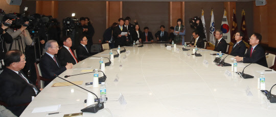 유일호 경제부총리 겸 기획재정부 장관(오른쪽 첫번째)이 지난 10일 오후 서울 남대문로 대한상공회의소 챔버라운지에서 열린 경제5단체장 간담회에서 발언하고 있다.
