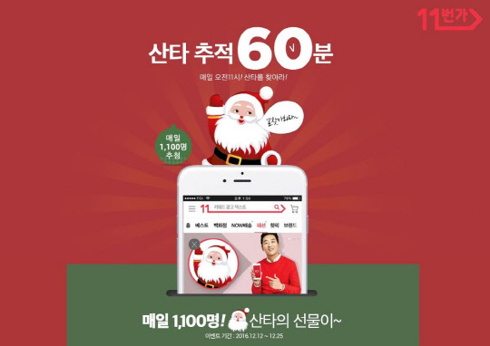 SK플래닛의 11번가는 크리스마스를 앞두고 오는 25일까지 매일 1100명에게 경품과 최대 30% 할인쿠폰을 제공한다고 14일 밝혔다. 먼저 매일 오전 11시부터 정오까지 11번가 홈페이지 곳곳에 숨어있는 '산타'를 찾는 고객 중 1100명을 무작위로 추첨해 산타 선물을 준다. '제주 켄싱턴 호텔 숙박권'은 1명, '신세계 5만원 모바일 상품권'은 29명, '아이헤이트 원데이 패션양말 5세트'는 70명, '스타벅스 아메리카노 Tall 기프티콘'은 1000명에게 제공한다.