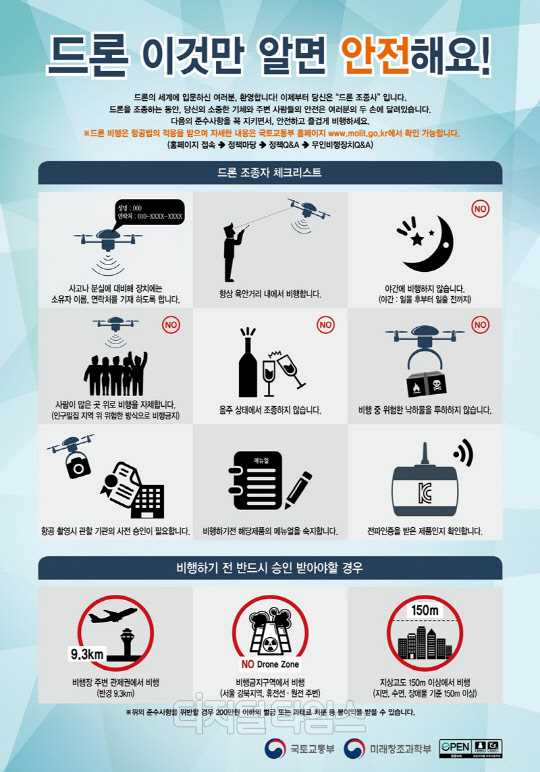 체크리스트에는 △드론 장치 내 소유자 이름·연락처 기재 권고 △야간·비가시 비행 금지 △인구밀집지역 비행 자제 △구매 전 전파인증 확인 △항공촬영 시 관할기관의 사전승인 필요 △음주 시 비행 금지 등 조종자 준수사항 및 권고사항이 담겨있다.