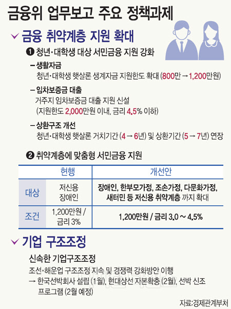정책금융 투입은 중소기업과 영세 자영업자 등에 집중된다. 지난해 121조4000억원보다 6조8000억원 증가한 128조2000억원을 중소기업 부문에 투입한다. 중소기업의 자금조달 어려움을 해소하고 경제 파급효과가 큰 일자리 창출형, 수출형 중소기업에 활기를 불어넣겠다는 전략이다. 영세 소상공인과 소기업에게도 1조원 증가한 12조원을 공급한다.