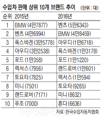 이들 브랜드가 폭스바겐과 아우디의 부진으로 생긴 공백을 모조리 흡수하면서 수입차 연간 판매 1만대 이상을 기록한 브랜드의 숫자도 역대 최고치를 기록했다. 2015년 BMW, 벤츠, 아우디, 폭스바겐, 포드 5개에서 지난해 렉서스와 랜드로버가 가세해 7개로 늘었다.