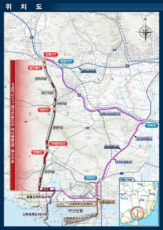 '부산항신항 제2 배후도로'는 부산항신항 웅동지구에서 남해고속도로 진례 분기점을 연결하는 연장 15.3㎞의 왕복 4차선 도로로 6281억원의 사업비가 투입됐다. 진해, 대청, 남진례 3개의 나들목과 남해고속도로와 접속을 위해 진례 1개 분기점을 각각 설치했으며 환경에 미치는 영향을 줄이고자 전체 구간의 72%를 터널(5개소, 9㎞) 및 교량(15개소, 2㎞)으로 건설했다.
