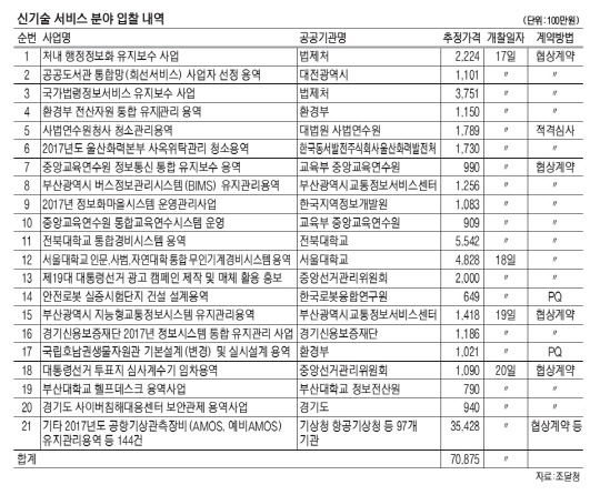 분야별로는 △환경부의 '전산자원 통합유지관리사업' 등 73건, 343억원 규모의 정보화사업 △전북대학교 통합경비시스템 용역 등 85건, 331억원 규모의 일반용역 사업 △국립호남권생물자원관 기본설계(변경) 및 실시설계 용역 등 6건, 34억원 규모의 건설용역 사업이 각각 진행된다. 법제처의 '국가법령정보서비스 유지보수사업'은 37억5100만원 규모로, 협상에 의한 계약방식으로 오는 17일 개찰한다. 또 환경부의 '전산자원 통합유지관리사업'과 부산시의 '부산시 버스정보관리시스템 유지관리용역'은 각각 11억5000만원, 12억5600만원 규모로 협상계약으로 진행된다. 이 가운데 정보화사업은 전체 73건이 대기업의 입찰참가자격 제한입찰 또는 중소기업간 경쟁 입찰로 이뤄져 343억원 상당을 중소기업이 수주할 것으로 전망된다. 일반용역은 10억원 이상 5건을 제외한 80건이 중소기업간 경쟁입찰 또는 10억원 미만 사업으로, 전체 금액의 56.2%인 186억원 상당을 중소기업이 수주할 것으로 예상된다. 지역별로 대전 소재 본청(238억원)과 서울지방청(193억원) 등 2개 청이 전체 금액의 60.8%를 차지하며, 기타 부산 등 10개 지방청은 277억원을 각각 집행한다.