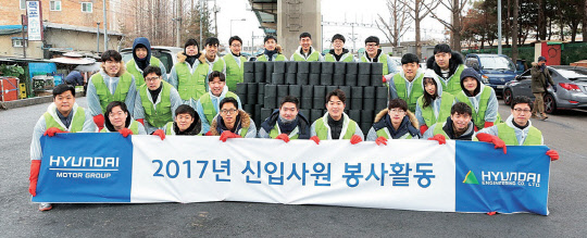 현대엔지니어링 신입사원들이 영등포 쪽방촌 주민들에게 연탄을 배달한 후 기념촬영하고 있다.