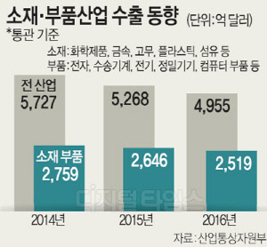 산업통상자원부는 작년 소재·부품 수출액은 전년보다 4.8% 감소한 2519억원, 수입액은 4.5% 감소한 1525억달러를 기록했다고 16일 밝혔다. 무역수지는 994억달러 흑자를 기록했지만 이 역시 5.3% 줄어든 액수다.