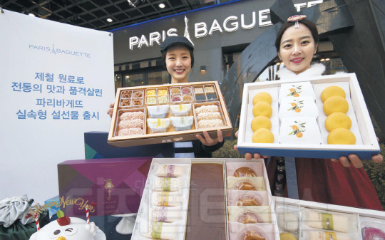 파리바게뜨가 16일 서울 종로구 서린동 종로시그니처점 앞에서 장기불황에도 부담없이 새해 인사를 전할 수 있는 1~2만원대 실속형 설 기획제품, '제주 천혜향파이'와 '궁중한과세트' 등을 선보이고 있다.