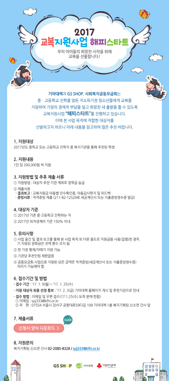 올해 지원대상은 2017년도에 중·고등학교에 진학하는 저소득층 가정 청소년으로 1인당 20만원, 총 1억원을 지원할 예정이다. 추천 복지기관 등이 기아대책 홈페이지에 올라온 신청서 양식을 작성해 담당자 이메일(syjj333@kfhi.or.kr)로 보내거나, 기아대책 복지기획팀에 우편으로 접수하면 된다.
