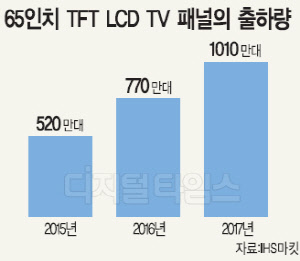 여기에 전 세계적으로 TV는 대형화하는 추세여서 65인치 LCD의 수요도 더 확대할 것으로 예상돼 삼성발 65인치의 공급 대란의 가능성도 점쳐진다. 시장조사업체인 IHS마킷에 따르면 세계 65인치 LCD 패널 출하량은 2015년 520만대, 2016년 770만대로 올해는 1010만대로 증가할 것으로 점쳐지고 있다. 65인치 LCD 패널 수급이 빠듯할 것으로 예상하는 가운데 이 디스플레이의 가격은 이미 상승 곡선을 그리고 있다. 지난해 10, 11, 12월 65인치 LCD TV 패널(UHD, 60㎐, 오픈셀 기준) 평균가격은 각각 360, 370, 375달러라고 IHS마킷은 밝혔다.