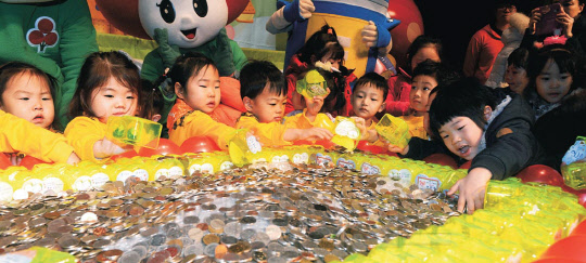 2일 서울 우장산로 강서구민회관에서 열린 '사랑의 저금통 나누기' 행사에서 관내 어린이집 원아들이 동전을 모으고 있다.