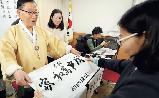 입춘을 이틀 앞둔 2일 서울 노원구 상계5동 주민센터에서 열린 '우리집 가훈 및 입춘첩 나눔' 행사에서 서예가가 주민에게 가훈을 전하고 있다.