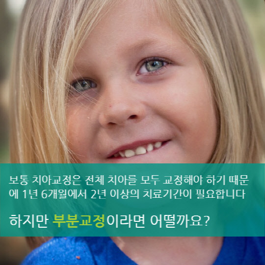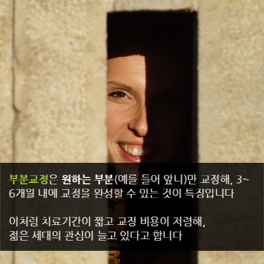 부분교정은 원하는 부분(예를 들어 앞니)만 교정해, 3~6개월 내에 교정을 완성할 수 있는 것이 특징이다. 이처럼 치료기간이 짧고 교정 비용이 저렴해, 젊은 세대의 관심이 늘고 있다.
