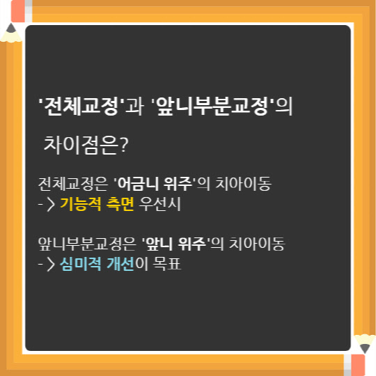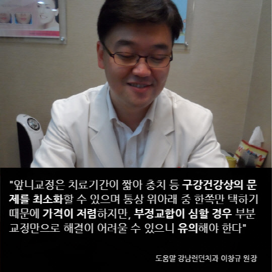 앞니교정은 치료기간이 짧아 충치 등 구강건강상의 문제를 최소화할 수 있으며 통상 위아래 중 한쪽만 택하기 때문에 가격이 저렴하지만, 부정교합이 심할 경우 부분교정만으로 해결이 어려울 수 있으니 유의해야 한다.