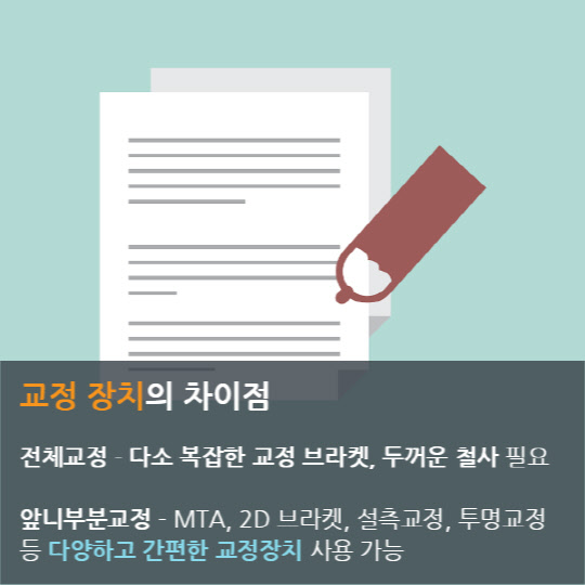 또 교정 장치에도 역시 차이가 있다. 전체교정의 경우 어금니를 움직여 기능적인 개선을 목표로하여 진행되기 때문에 다소 복잡한 교정 브라켓과 두꺼운 철사 등이 필요하지만, 앞니부분교정은 MTA, 2D 브라켓, 설측교정, 투명교정 등 보다 간편한 교정 장치 사용이 가능하다.