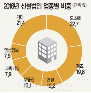 이는 2000년 통계 작성 이후 가장 많은 규모다. 업종별로는 도소매업이 2만1780개로 가장 많이 설립됐고, 제조업(1만9037개), 건설업(9825개)이 뒤를 이었다. 다만 대외 불확실성 확대와 조선·해운업 구조조정 등의 영향으로 제조업 분야 신설법인은 전년보다 1118개 감소했다.