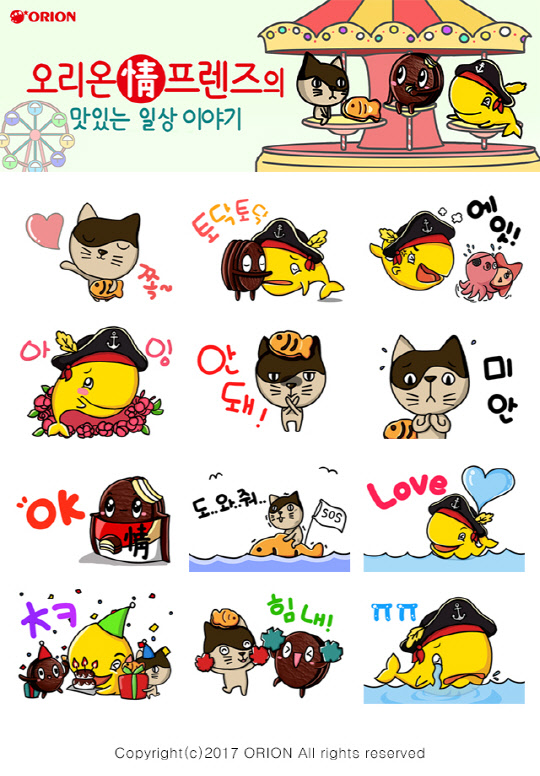 오리온이 '초코파이정' '고래밥' '참붕어빵'의 캐릭터를 활용한 카카오톡 이모티콘을 7일 선보였다.