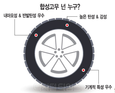 합성고무는 높은 탄성과 강성을 지니고 있어 타이어가 지녀야 하는 내마모성은 물론 반발탄성, 기계적 특성이 우수하기 때문입니다. 이러한 합성고무는 타이어뿐 아니라, 기기 작동을 위한 벨트, 호스, 신발 등 다양한 분야에서 사용되고 있는 고기능성 소재입니다. 최근에는 자동차의 핵심부품인 타이어는 그 역할에 따라 필요한 기능적인 부분을 소재의 기술로 적용하는 시도가 나오고 있습니다.
