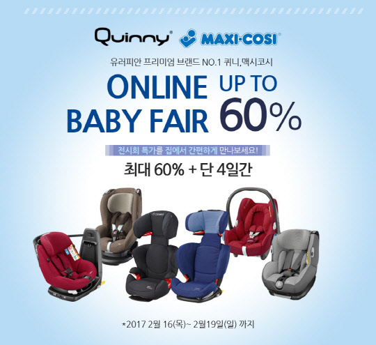 이번 기획전에서는 두 브랜드 제품을 최대 59% 할인 판매한다. 퀴니에서는 신생아부터 5세까지 이용할 수 있는 모델 2종을 선보인다. 대표 상품으로 유러피안 스타일과 기능을 갖춘 '무드(68만9000원)', 시트와 프레임을 분리하지 않고 손쉽게 접고 펼 수 있는 '제프 엑스트라 2.0(29만9000원)' 등이 있다.맥시코시에서는 신생아용·주니어 카시트를 모두 선보인다.