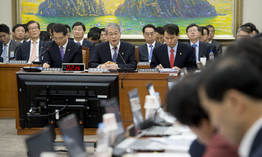 임종룡 금융위원장(앞줄 왼쪽 두 번째)이 16일 국회에서 열린 정무위원회 전체회의에서 의원들의 질의에 답하고 있다. 이날 회의에서는 삼성그룹에 대한 특혜 의혹과 정찬우 한국거래소 이사장(전 금융위 부위원장)의 인사개입 의혹에 대한 국회의원들의 추궁이 이어졌다.
