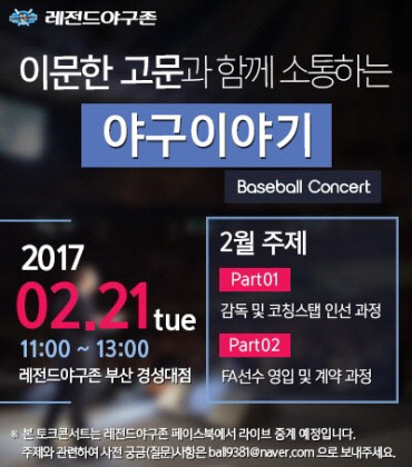 부산 경성대점에서는 오는 2월 21일 화요일, '이문한 고문과 함께 소통하는 야구 이야기' 이벤트가 열린다. 작년 11월에 이어 두 번째로 진행되는 이번 토크 콘서트에서는 감독 및 코칭 스탭의 인선 과정, FA선수 영입 및 계약 과정 등 어디서도 들을 수 없었던 생생한 야구 이야기가 펼쳐질 예정이다.