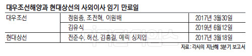 지난해 정부 주도의 구조조정으로 명운이 갈렸던 해운업계 역시 사외이사들이 경영 부실을 사실상 방치한 정황이 짙다. 현대상선은 내달 18일 4명의 사외이사의 임기가 만료한다. 이중 2005년 이후 사외이사를 맡아 온 에릭 싱 치 입 허치슨포트홀딩스 사장은 지난해 26번 열린 이사회에 모두 불참했다. 회사가 수년간 경영이 악화한 속에서 '2016년 사업계획'을 상정한 이사회에는 2명의 사외이사가 참석하는 데 그쳤다. 현대부산신항만과 벌크선 매각 등 알짜 자산 매각을 결정하는 건 역시 사외이사의 절반만 의사결정에 참여했다. 채권단이 조건부 자율협약을 개시하기에 앞서 생사기로에 놓인 중요한 시기임에도 사외이사들은 적극 나서지 않았다.