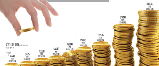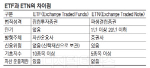 상장 펀드·채권에 투자… 발행 주체·만기유무 등 달라 ETF, 지수 흐름대로 수익률 결정 자산운용사서 발행… 신용 위험 없어 아시아 첫 액티브형 국내 상장 예고 ETN, 증권사 파산시 투자자가 손실 두 상품 원금 보장 안돼… 투자 주의