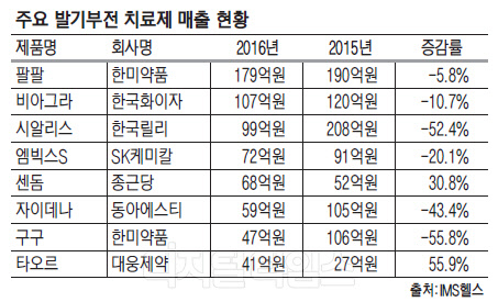 특히 상위권에 포진한 제품은 전년대비 30.8% 성장한 센돔을 제외하고 모두 매출이 감소했다. 1위 제품인 팔팔도 5.8% 감소했고, 오리지널인 비아그라와 시알리스가 복제약 출시 영향으로 각각 10.7%, 52.4%, 토종 발기부전 치료제인 엠빅스S와 자이데나가 20.1%, 43.4% 매출이 감소했다. 구구도 매출이 55.8% 줄었다.