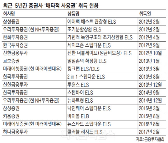 특히 2012년 이후 ELS의 배타적 사용권 취득이 급증했는데, 총 17개 금융투자상품 중 미래에셋증권(현 미래에셋대우)의 '킹크랩 DLS', 삼성증권의 '롱숏 스프레드 주가연계파생결합사채(ELB)', 키움증권의 바이볼 ELB를 제외하면 모두 ELS다.