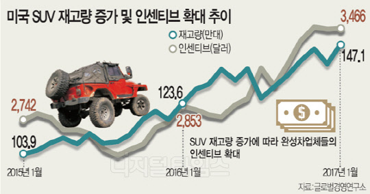 닛산은 소형 SUV '로그 스포츠' 출시로 북미 내 총 6개 SUV 제품군을 구축했고, 포드는 2020년까지 SUV 제품군을 포드 브랜드 5개와 링컨 브랜드 1개씩 추가할 계획이다. 토요타는 지난해 북미 SUV 생산 규모를 5.6% 확대했다. 반면 지난해 이후 미국 시장 전체가 성장 정체기에 진입하면서 승용차뿐 아니라 SUV 판매 증가세도 둔화하는 추세다. 이에 따라 미국 시장의 SUV 재고는 지난달 147만797대를 기록하며 전년 동기보다 23만4911대(+19.0%) 증가했다.