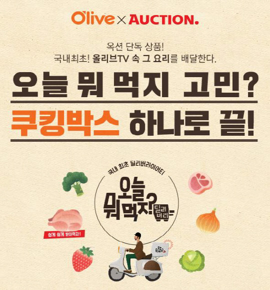 옥션은 올리브TV와 손잡고 딜리버라이어티 프로그램 '오늘 뭐 먹지?'에서 우승한 메뉴의 식재료를 넣은 '쿠킹 박스'를 단독 판매한다. 쿠킹박스에는 소금 1g, 레몬 2분의 1, 양파 70g 등 실제 요리에서 사용한 식재료를 최적화된 정량만 담아 구성했다. 이 식재료를 그대로 활용하면 TV 속 요리를 그대로 즐길 수 있다. 옥션은 지난달 28일 방송에서 소개한 첫 번째 우승 레시피 '삼치 라비올리(2만9000원)'를 선보여 고객들에게 호응을 얻고 있다.