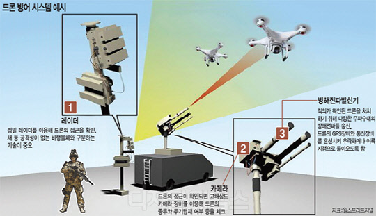 ◇능동적 방어로 '안티드론' 잡는다=능동적 방어 방식에는 드론 잡는 드론기술, 전파방해 기술, 화기·EMP·레이저를 이용한 드론 타격기술 등 이 있습니다.