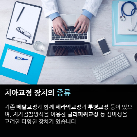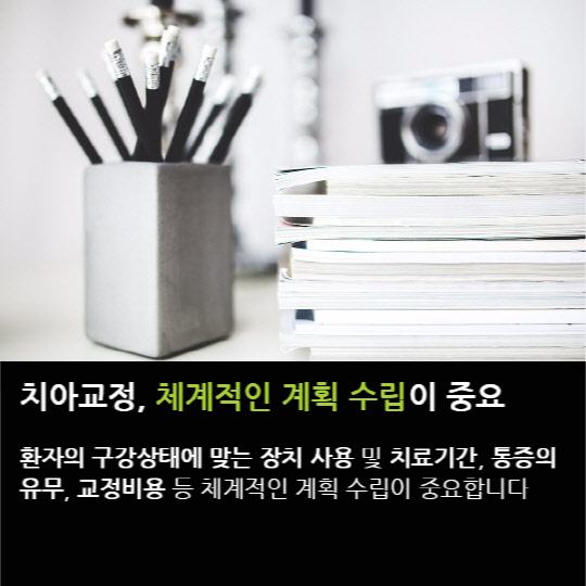 치아교정 시 체계적인 계획 수립이 중요하며 환자의 구강 상태에 맞는 장치 사용 및 치료기간, 통증의 유무, 교정비용 등 체계적인 계획 수립이 중요하다. 교정 장치의 종류는 기존 메탈교정과 함께 세라믹교정과 투명교정 등이 있으며, 자가결찰방식을 이용한 클리피씨교정 등 심미성을 고려한 다양한 장치가 있다.