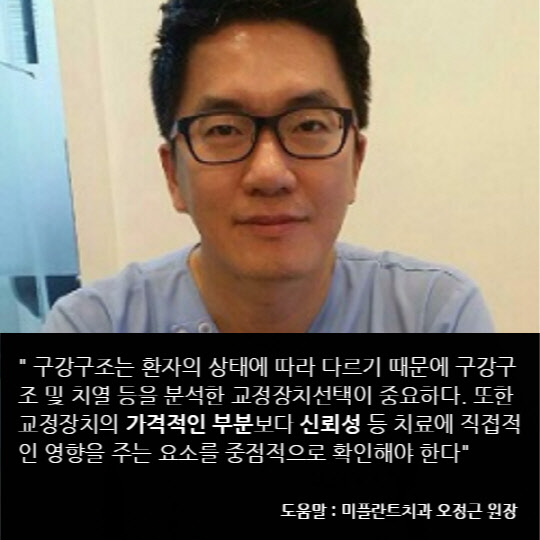 구강구조는 환자의 상태에 따라 다르기 때문에 구강구조 및 치열 등을 분석한 교정장치선택이 중요하다. 또한 교정장치의 가격적인 부분보다 신뢰성 등 치료에 직접적인 영향을 주는 요소를 중점적으로 확인해야 한다.