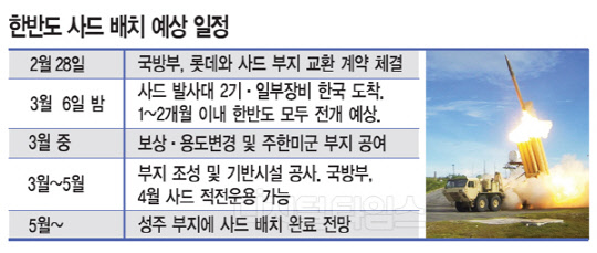 고고도미사일방어체계(THAAD·사드)의 주한미군 배치 시기는 예정보다 크게 앞당겨질 것으로 보인다. 당초 6∼8월 중 사드가 한반도에 배치될 것으로 전망됐지만 7일 사드의 한반도 전개작업이 시작됐다. 사드는 빠르면 4월부터 작전 운용에 들어갈 수 있다는 분석이 나오고 있다.