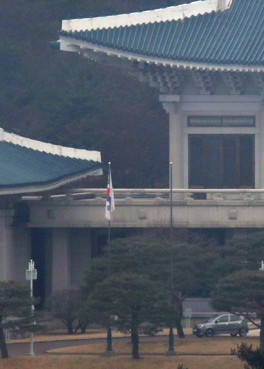 12일 청와대 본관에 위치한 국기 게양대에는 대통령을 상징하는 봉황기는 내려져 있고 태극기만 걸려 있다. 청와대는 박근혜 전 대통령에 대한 헌법재판소의 파면선고가 내려진 지난 10일부터 봉황기를 게양하지 않고 있는 것으로 알려졌다. 청와대 관계자는 헌재의 파면 결정으로 현직 대통령이 부재한 상태기 때문에 이 같은 조치를 했다고 설명했다.