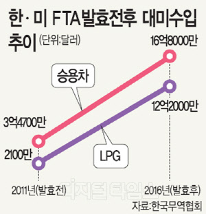 의약품과 FTA 체결 당시 광우병 논란이 있었던 가축육류의 지난해 수입규모도 2011년과 비교해 크게 늘었다. 10대 대미 수입품목의 전체 수입규모는 2011년 137억6600만달러에서 167억9400만달러로 22%가량 증가했다.
