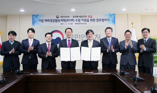 한국동서발전이 협력기업의 재난안전강화를 위해 국민안전처와 업무협약을 맺었다. 사진은 김희겸 국민안전처 재난관리실장(왼쪽 세번째), 김용진 한국동서발전 사장(왼쪽 네번째) 등이 협약을 맺고 기념촬영을 하는 모습.