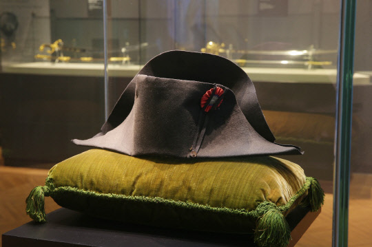 이날 문을 연 나폴레옹 갤러리에서는 김 회장이 2014년 프랑스 오세나 경매에서 188만4000유로(당시 한화 26억원)에 낙찰받은 나폴레옹의 이각모(사진)가 공개됐다. 이 모자는 나폴레옹이 1800년 6월 이탈리아 마렝고 평원에서 오스트리아군과 치른 전투에서 쓴 것으로 나폴레옹의 수의사인 조제프 지로가 넘겨받아 후손들이 보관했다. 이후 모나코 왕실이 사들여 소장해오다 왕실 수리비를 충당하기 위해 경매에 내놓은 것을 김 회장이 사들인 것. 갤러리에는 나폴레옹 초상화와 덴마크 국왕이 준 훈장, 원정 시 썼던 은잔, 이각모 증빙문서 등도 전시됐다.