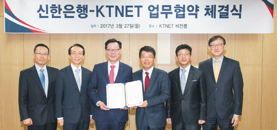 27일 경기도 성남시 한국무역정보통신 사옥에서 진행된 '전자무역 활성화 및 신사업 모델 개발을 위한 업무협약식'에서 (왼쪽부터)최태광 한국무역정보통신 금융사업실장과 오선근 상무, 최병화 신한은행 부행장, 한진현 한국무역정보통신 사장, 정지호 신한은행 외환사업본부장, 서승현 신한은행 외환사업부장이 기념촬영을 하고 있다.