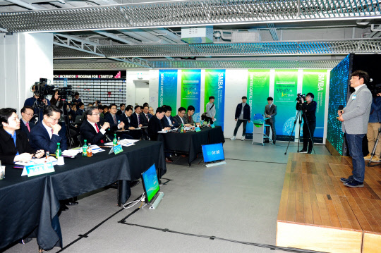 중기 '찾아가는 투자 IR' 행사28일 서울 역삼로 팁스타운에서 열린 '찾아가는 투자 IR' 행사에서 생체친화적 임플란트 소재 제조기업인 최원석 에이앤비바이오메디 대표(오른쪽)가 벤처캐피탈 투자자를 대상으로 기업 소개를 하고 있다.