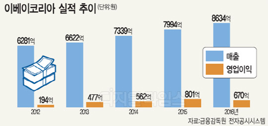 지난해 다른 오픈마켓과 소셜커머스와의 경쟁이 치열해짐에 따라 마케팅 비용을 늘리면서 영업이익은 감소했다. 판매관리비는 4197억원으로 전년보다 5.4% 늘었고, 판매촉진비는 1.1% 늘어난 391억원, 광고선전비는 3.9% 증가한 1839억원이었다. 영업이익은 지난해보다 줄었지만 흑자를 유지했다. 최근 5년간 이베이코리아의 매출과 영업이익은 각각 연평균 14.8%, 66.2% 늘었다.