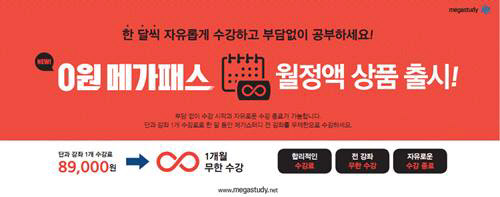 메가패스 월정액 상품은 단과 강좌 1개 수강료로 한 달 동안 메가스터디 전 강좌를 무제한으로 수강할 수 있다. 부담 없는 수강 시작과 동시에 자유로운 수강 종료가 가능한 것. 파격적인 상품 구성뿐 아니라 해당 상품 출시 기념으로 1+1 이벤트를 동시 진행한다. 상품을 신청하면서 지인의 ID를 등록 시 본인은 물론 지인까지 메가패스를 30일간 무료 수강할 수 있다.